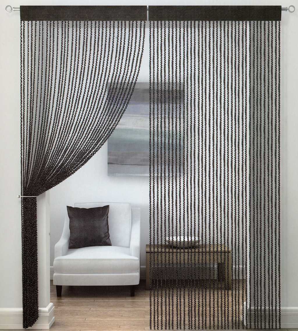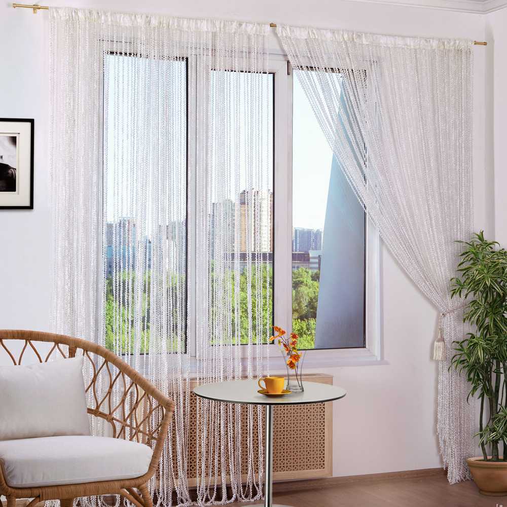 Такие нитевые шторы смотрятся очень эффектно. Подбирайте рисунок на свое усмотрение — главное, чтобы он сочетался с общим интерьером.