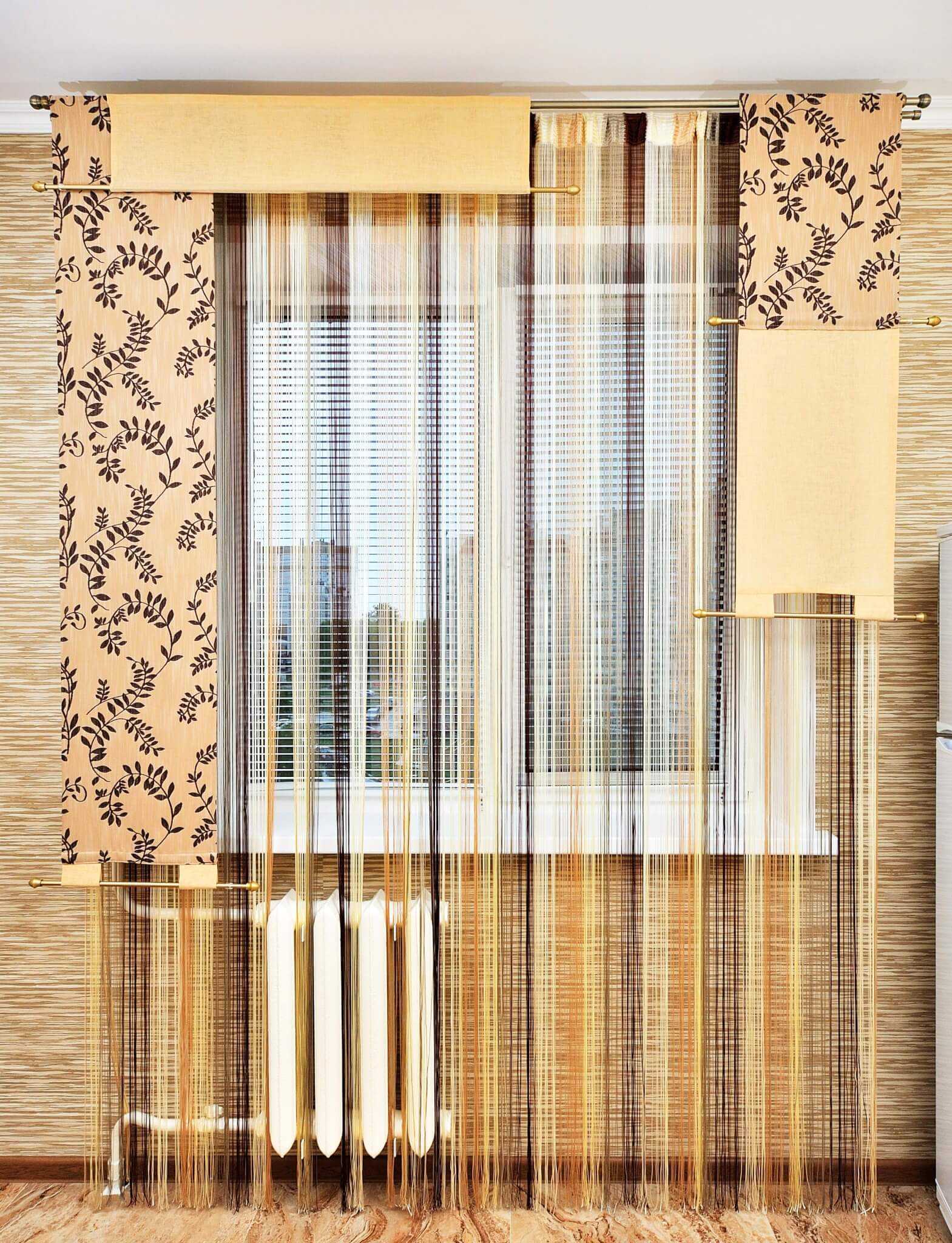 Нити могут играть роль основы, а тканевые шторы драпироваться в виде ламбрекена. Или же наоборот, кисея может стать легким украшением более плотной материи.