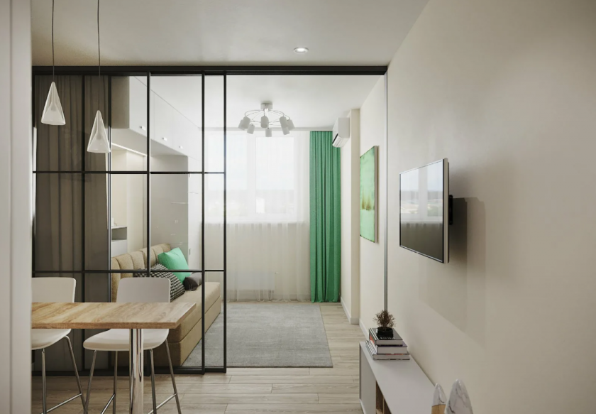 Квартиры-студии с небольшой площадью дополняют прозрачными перегородками, изготовленными из стекла или комбинированных материалов.