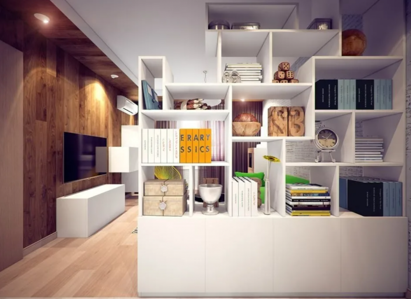 Также могут оригинально смотреться сквозные конструкции или стеллажи, высота которых доходит до потолка.