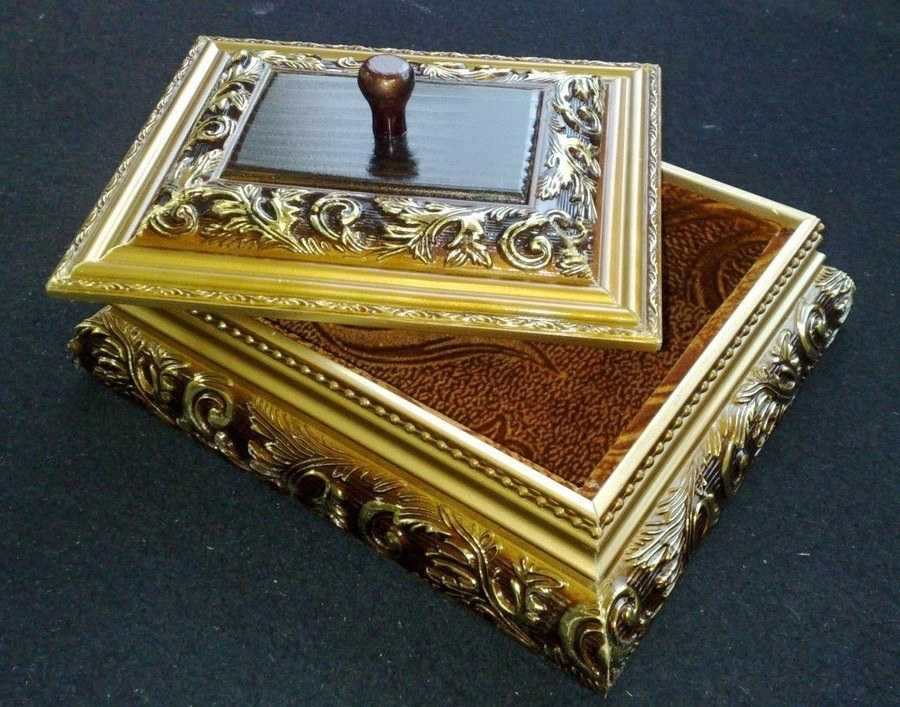 Шикарно и изящно смотрится шкатулка, выполненная из багета. Багет – специальный материал, использующийся для создания картинных рамочек. В продаже можно найти материал из дерева или пластика.
