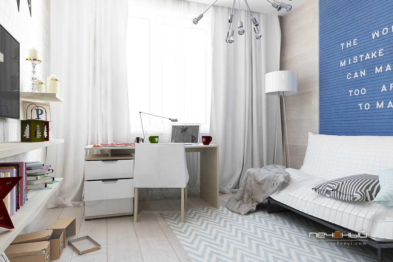 Рассматриваемый стиль с его сдержанностью и простотой отлично подойдёт для оформления холостяцкой квартиры и, в частности, спальни. Для этого подойдёт сочетание белого с синим и серым.