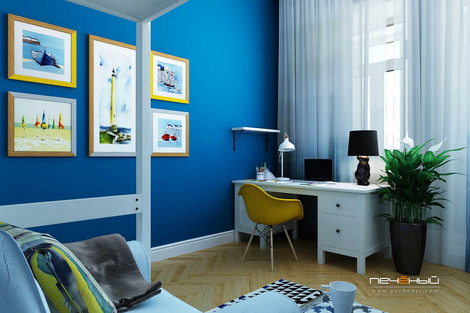 Ещё один дизайн мужского характера подойдёт для спальни мальчика-подростка: заметные жёлто-голубые акценты выдают детскую комнату, а обилие серо-коричневой гаммы говорит, что ребёнок уже идёт по пути к взрослой жизни.