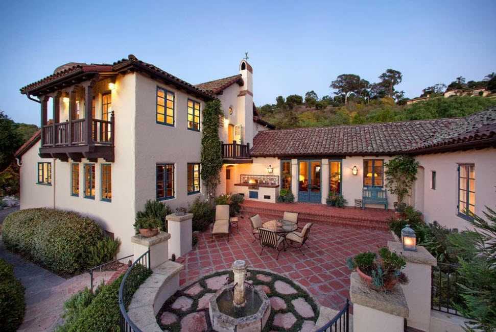 Испанский колониальный дом. Для отделки фасада используют светлую штукатурку, в качестве кровельного материала применяется красная черепица, окна имеют арочную форму, двери украшают кованые или резные детали.