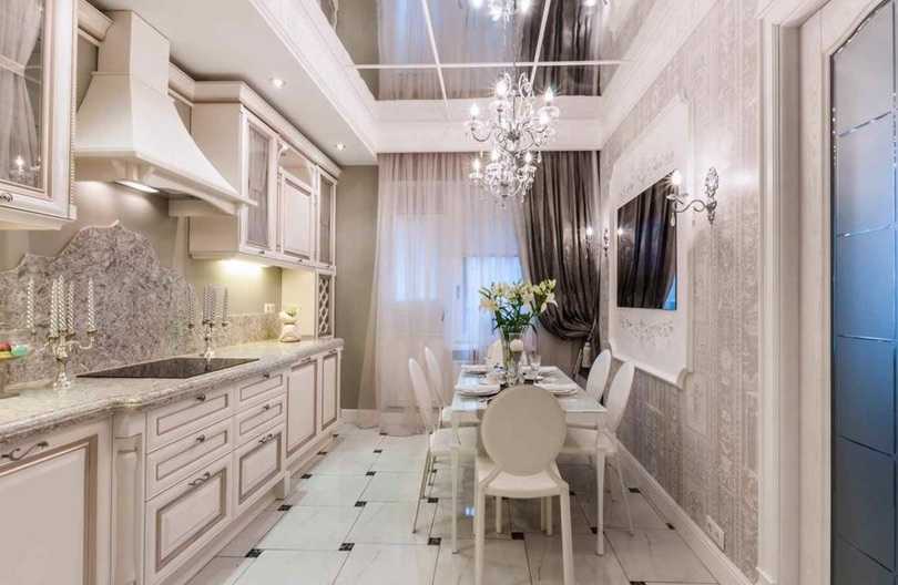 Владельцам узких и длинных кухонь имеет смысл отказаться от установки двери, а вместо нее оставить только арку. Такой прием визуально немного расширит пространство.