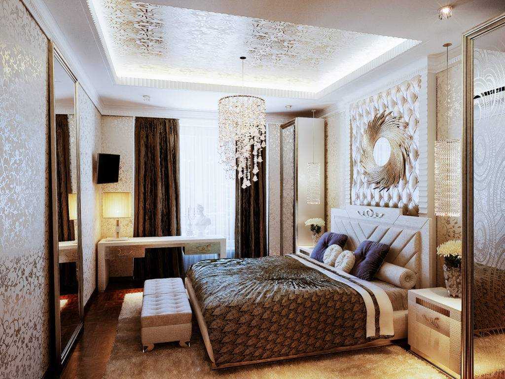 Ещё один дизайн роскошной спальни для ЖК «Лица». Объёмная люстра, дизайнерские прикроватные тумбочки и зеркальная стена с орнаментом отлично сочетаются с кроватью, чья спинка-кокон располагает хозяев к уютному и комфортному сну. Здесь можно видеть удачное зонирование пространства для небольшого помещения: телевизор, туалетный столик и система хранения – всё это размещено в уютной комнате, но в то же время не загромождает пространство.