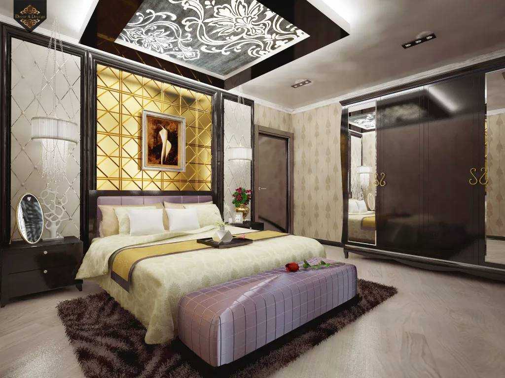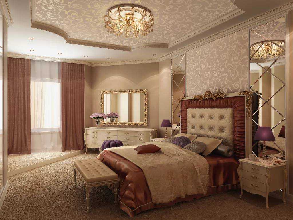 Визуально поднять невысокие потолки в спальне позволят зеркальные панели. Они монтируются фрагментарно или полосами. На каждом уровне присутствуют позолоченные или посеребренные орнаменты. Для спален с высокими потолками используются массивные узоры из лепнины, создающие уют. Из гипсокартонных конструкций сооружаются балки, украшаемые лепниной, из которых составляется кессонный потолок.