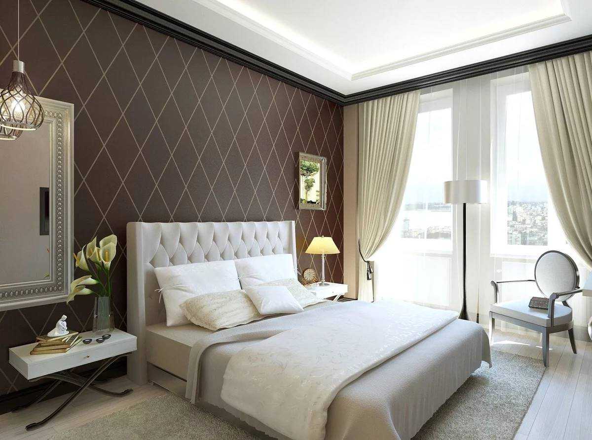 Стены спальни в зоне изголовья кровати отделывают обоями с имитацией шелка и другого богатого текстиля. По обеим сторонам располагают ночники. Одну из длинных стен в комнате можно полностью заставить мебелью.