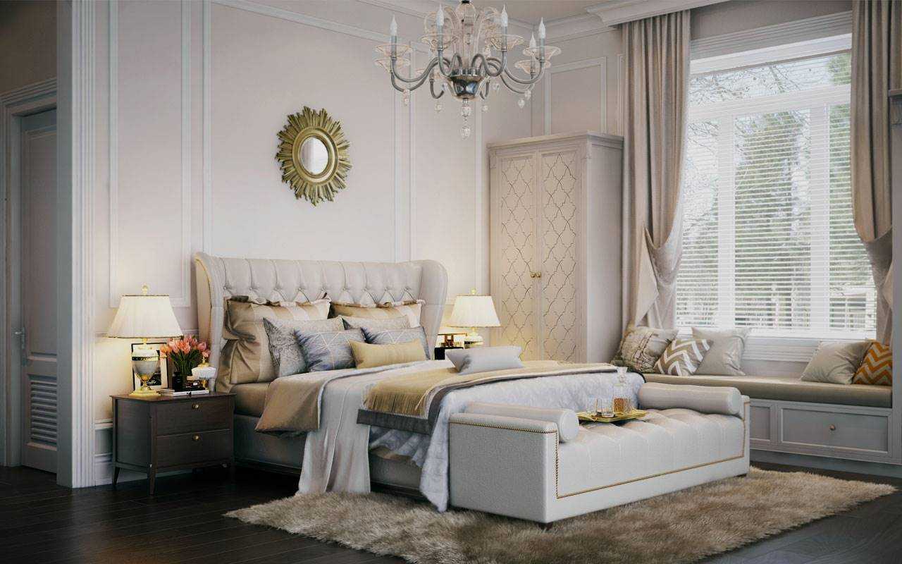 Здесь есть всё: и комфортная дневная зона отдыха, и уютная кровать с мягким изголовьем. Пространство спальни визуально увеличивают теплые бежевые оттенки, а роскошная люстра и золотое обрамление потолка подчёркивают атмосферу стиля арт-деко.