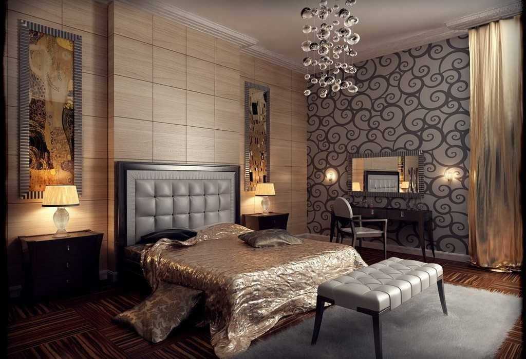 Стены спальни в арте деко являются завершенными картинами, поэтому к их отделке важно подойти ответственно. В качестве решений используется: