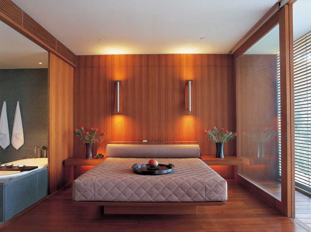 Спальную комнату, оформленную в китайском стиле, украшает низкая кровать