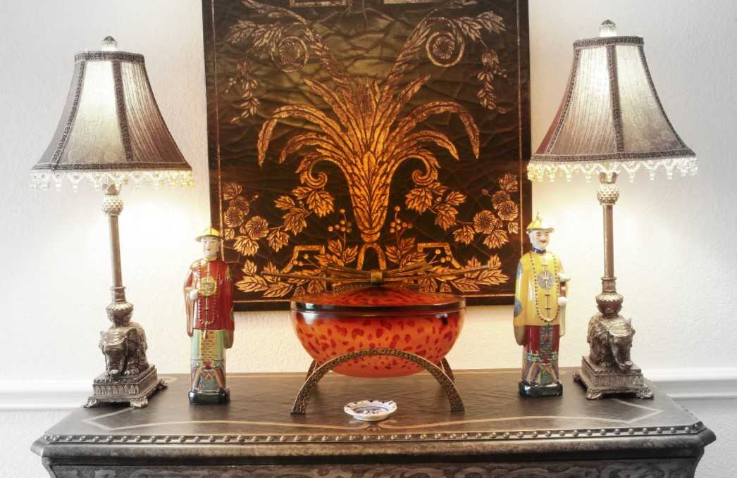 Картины с изображением природы и китайские фигуры можно использовать для декора
