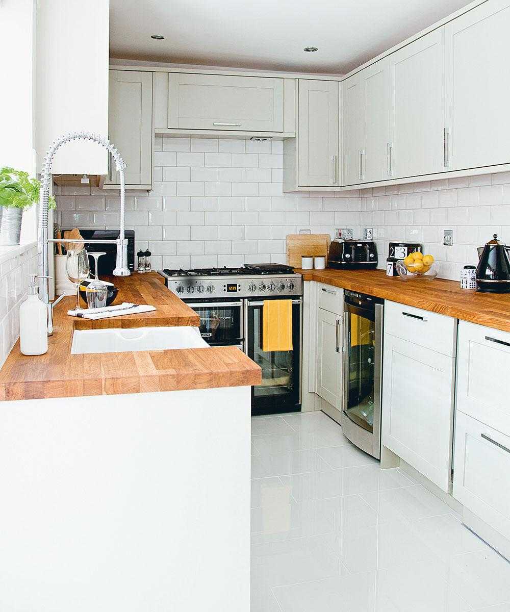 Компактная кухня будет казаться визуально больше, если для отделки стен и потолка использовать светлые тона