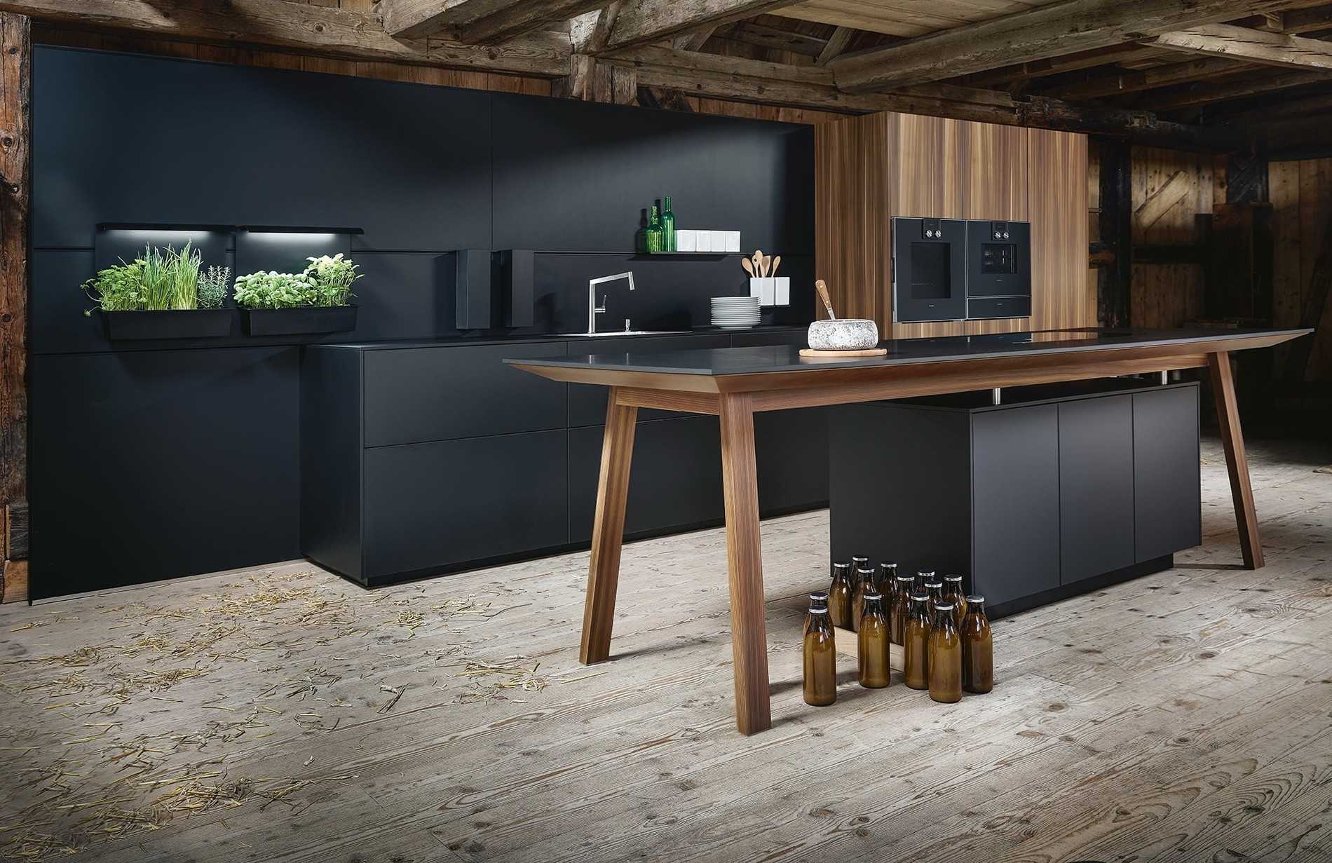 - встроенная кухня до потолка с фасадами под дерево или металл;