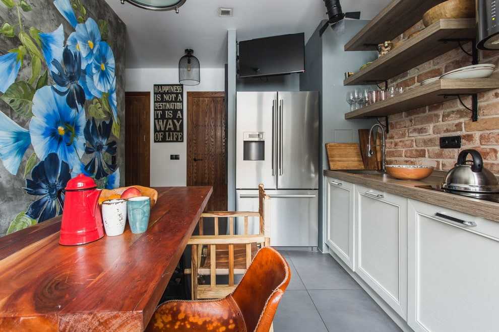 Стиль лофт выбирают натуры, которым нравится простой и лаконичный интерьер, без лишних перегородок, стен и дверей. Сначала он использовался для индустриальных помещений с большими потолками, поэтому в чистом виде будет визуально уменьшать и без того маленькую кухню.