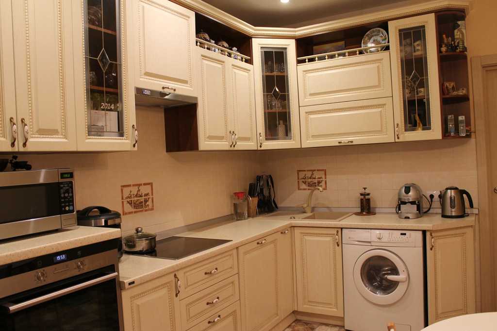 - Классика – фасады с фрезеровкой, лепнина на потолке, витиеватый декор, изысканные молдинги, золотые компоненты, кремовые обои, фартук из плитки, имитирующей рисунок камня, гардины теплых расцветок.