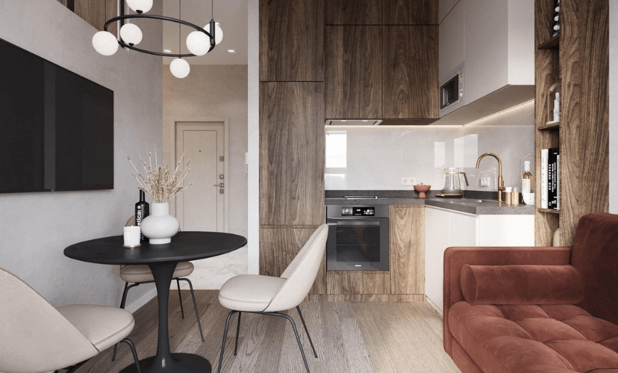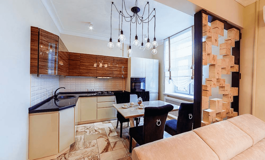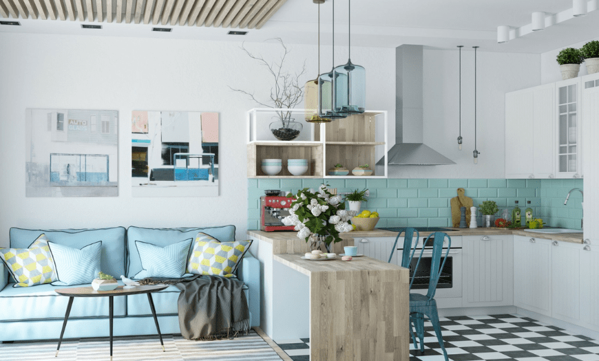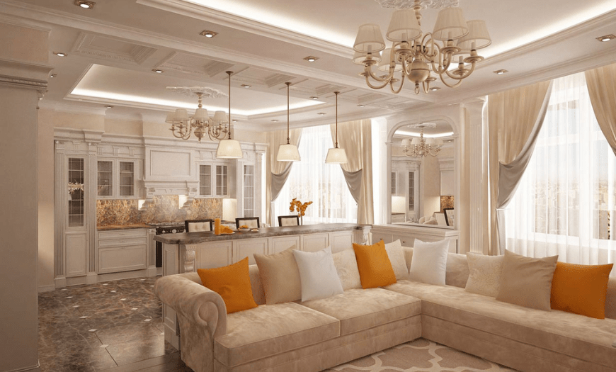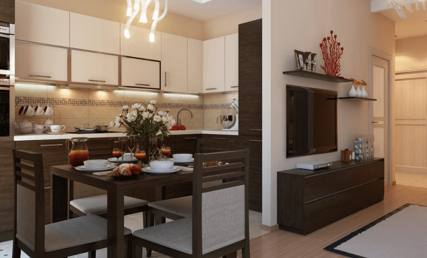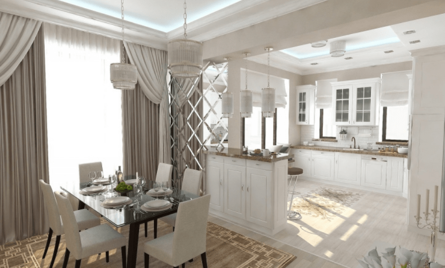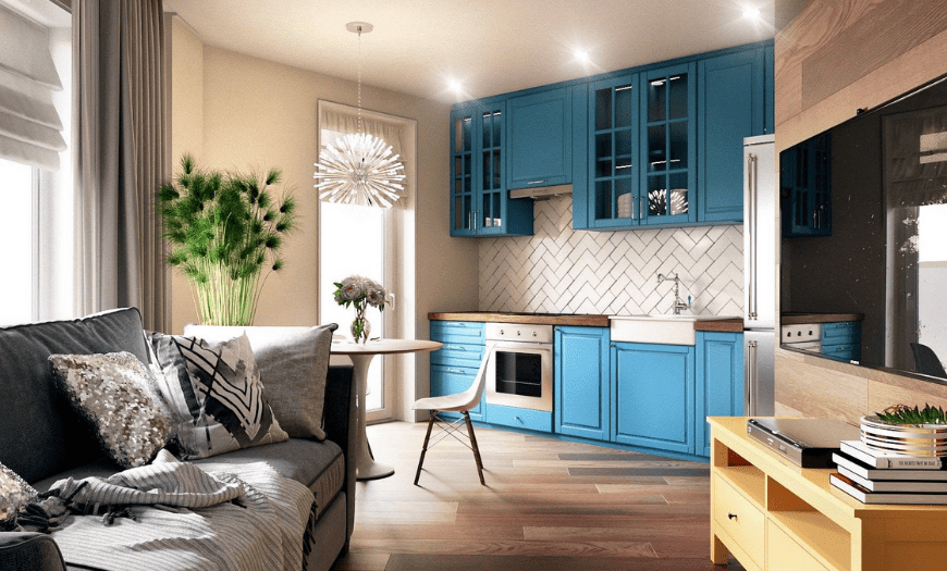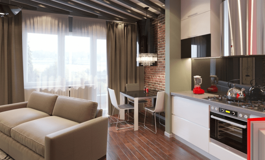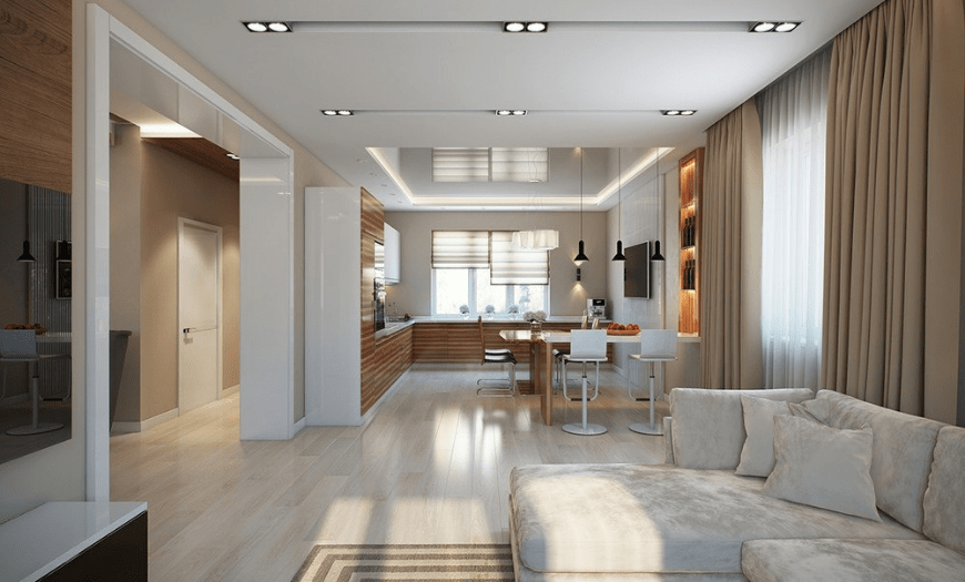При небольшой площади жилья можно оформить в монохроме. Применение одного цвета стирает границы, помещение становится единым целым и увеличивается визуально. Классика – светлые тона. Разделить зоны можно барной стойкой.