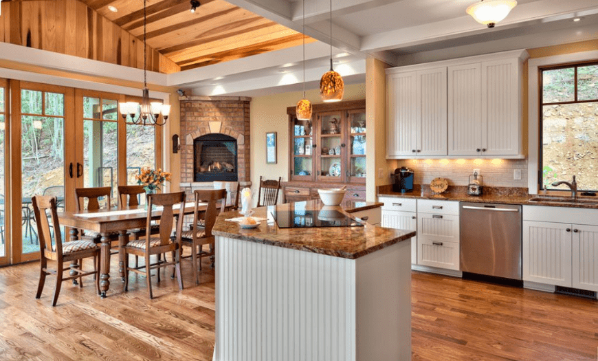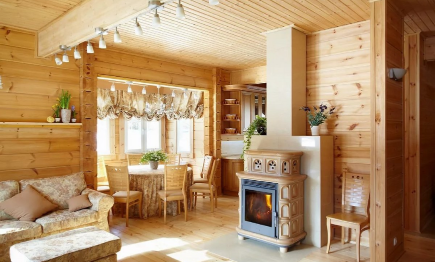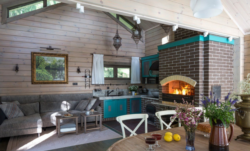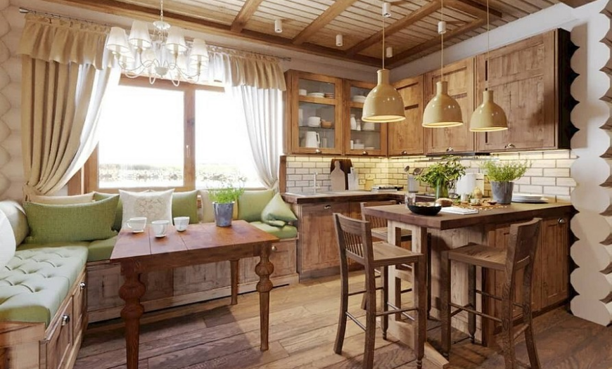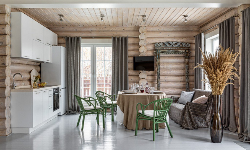 Для дачного домика подходит скандинавский стиль со светлыми оттенками, максимумом натурального освещения, деревянной мебелью. Варианты зонирования – перегородками, барной стойкой, длинным прямоугольным кухонным столом или диваном. Также будет хорошо смотреться интерьер в стиле “Шале”, кантри, прованс.