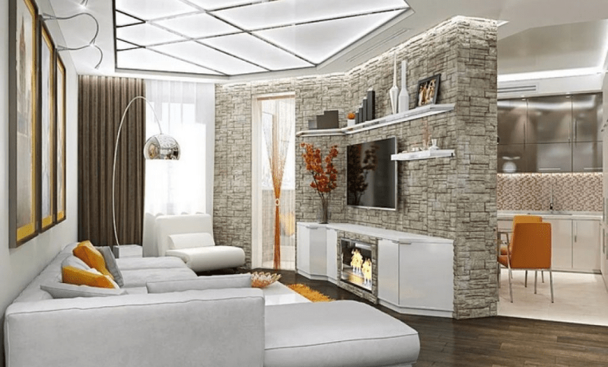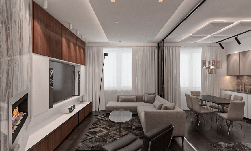 Кухня-гостиная необычной формы отличается наличием одного, двух или более нетипичных углов. Для того, чтобы уравновесить неправильную планировку, выполняют зонирование пространства. В комнате в форме трапеции можно выделить функциональные зоны контрастным цветом или сконструировать подиум. Создать стандартные прямые углы в треугольном помещении помогут мебельные предметы и полки, встроенные в ниши.