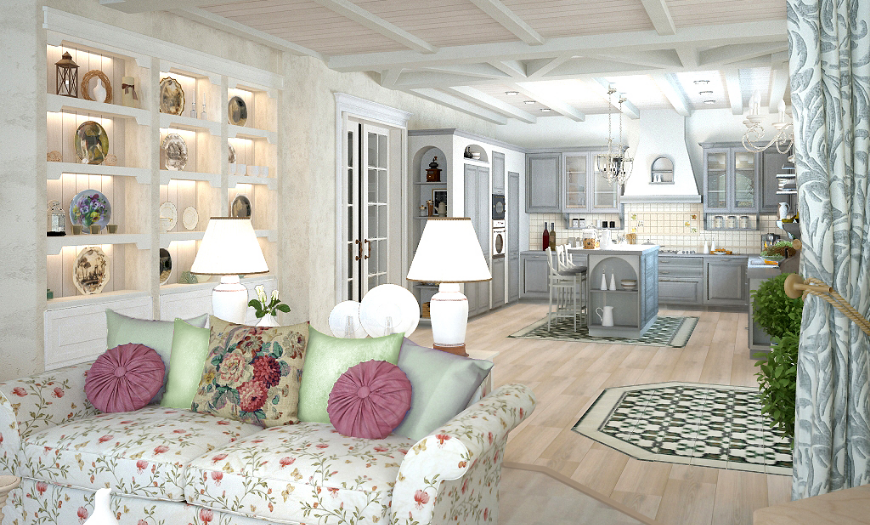 Основные черты – сдержанные постельные тона, минимум ярких цветовых акцентов, деревенская простота, искусственно состаренная мебель и природные материалы. Отделка не приемлет глянца, позолоты, контрастности.
