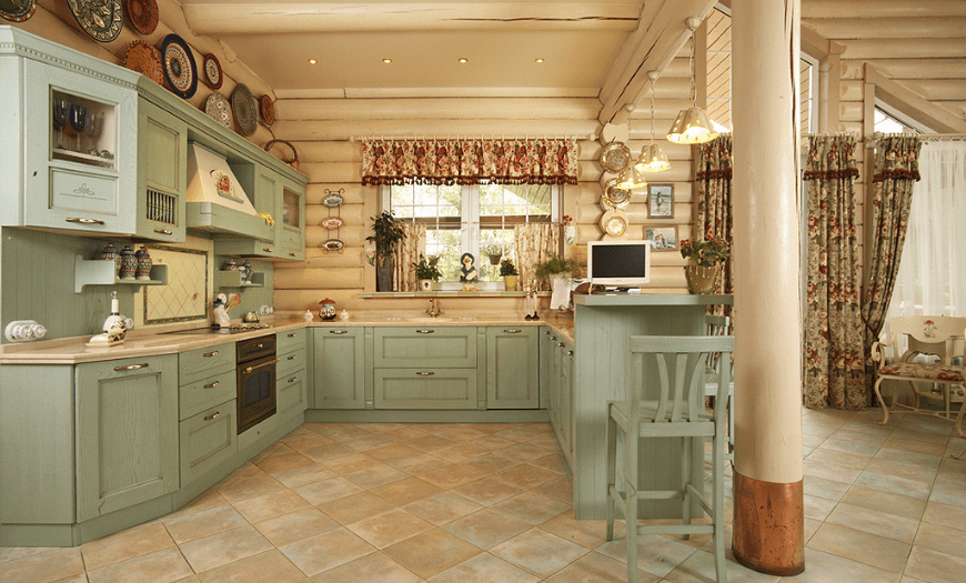 Прованс – идеальное решение. Здесь используются светлые и голубые тона, дерево и камень, паркет и керамогранит. Но, к сожалению, его рекомендуют для просторных кухонь в загородных или частных домах, с практически неограниченным пространством, которое наполнено светом при натуральном и искусственном освещении.