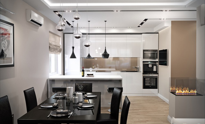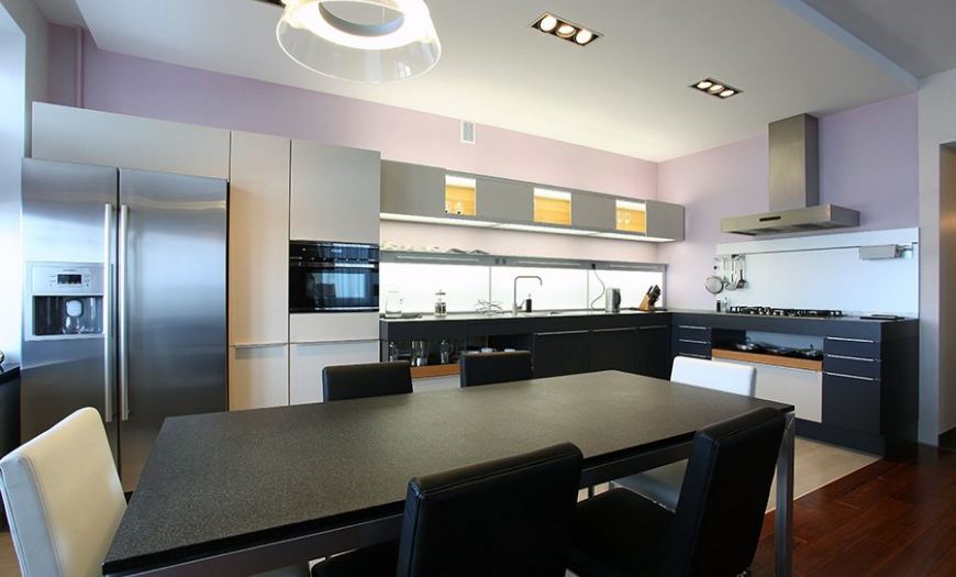 Современный, с его сугубой функциональностью и технологичностью – серо- или черно-белые оттенки гаммы, с грилем и фритюрницей, вытяжкой, посудомойкой и шкафом для подогрева посуды, выполненными в металле или близких по тонам материалах.