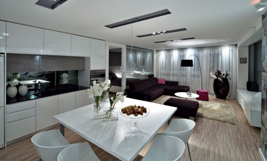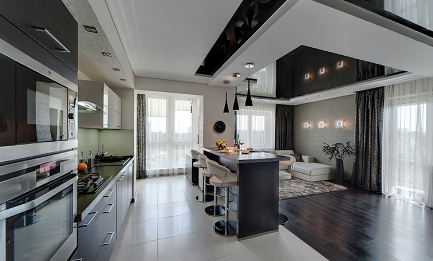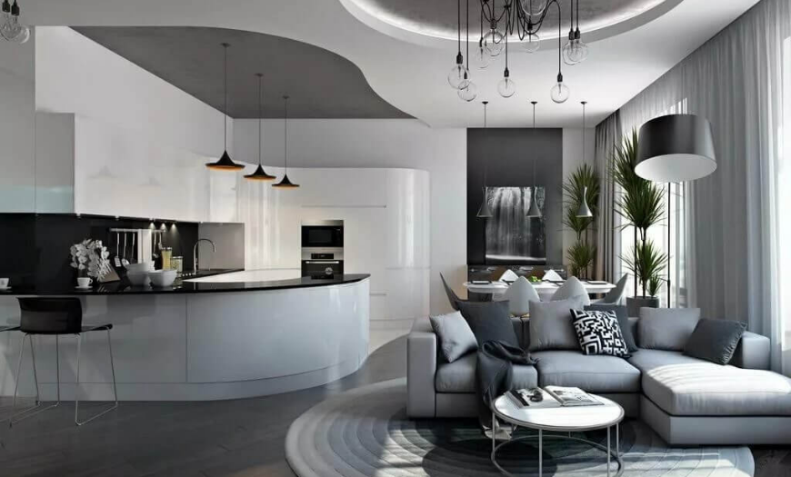 При таком интерьере гостиной, совмещенной с кухней, ведущей становится техника, повсюду экраны, мониторы, сенсоры. Предполагается максимальное удобство и многофункциональность при общем минимализме.