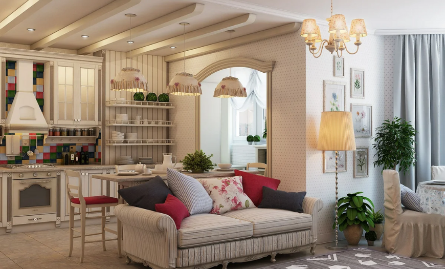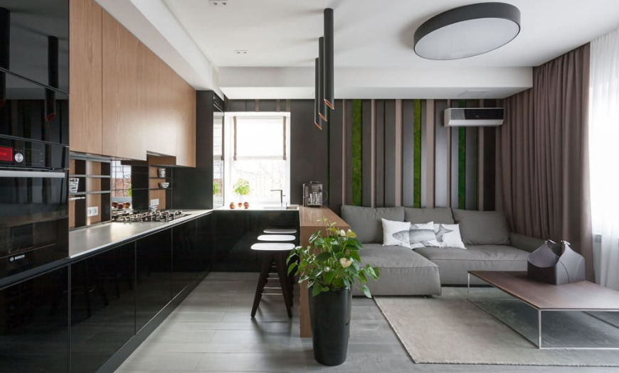 - соблюдайте выбранный стиль во всем помещении – и в зоне кухни, и в зоне гостиной;