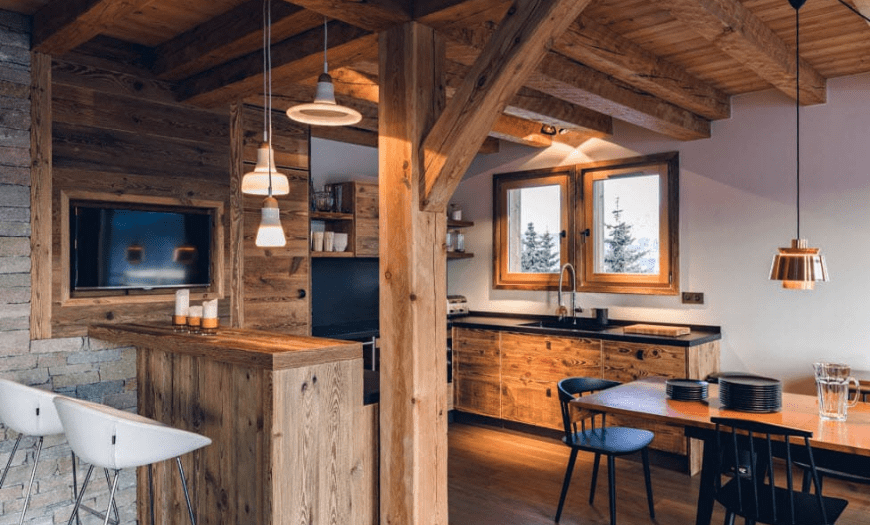 Еще одно современное решение: зонировать кухню с помощью перегородок из реек, расставить акценты, выполнив из дерева барную стойку, либо остров.