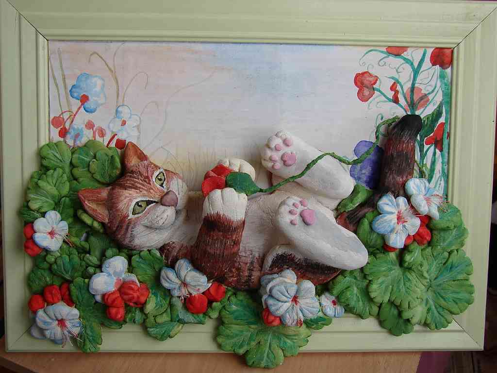 После этого можно переходить к панно с цветами и котами на все том же темном фоне, который задает вечернее настроение. Проволока пригодится для создания стеблей, хвостов, усов и лап.