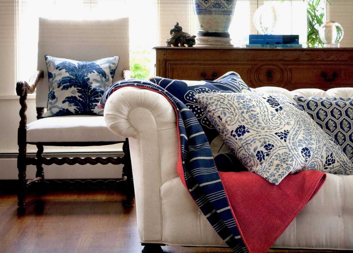 Подбирая ткань для диванных подушек, необходимо правильно подбирать ее к обивке дивана. Если она выполнена из велюра, то подушка из льна или хлопка будет смотреться неуместно