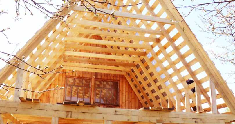 Для монтажа кровли требуется установить каркас. Система стропил чаще всего собирается на земле, после чего поднимается наверх. Для стропил как правило используется брус с сечением 50 на 150 миллиметров и закрепляется под углом в 50 градусов.