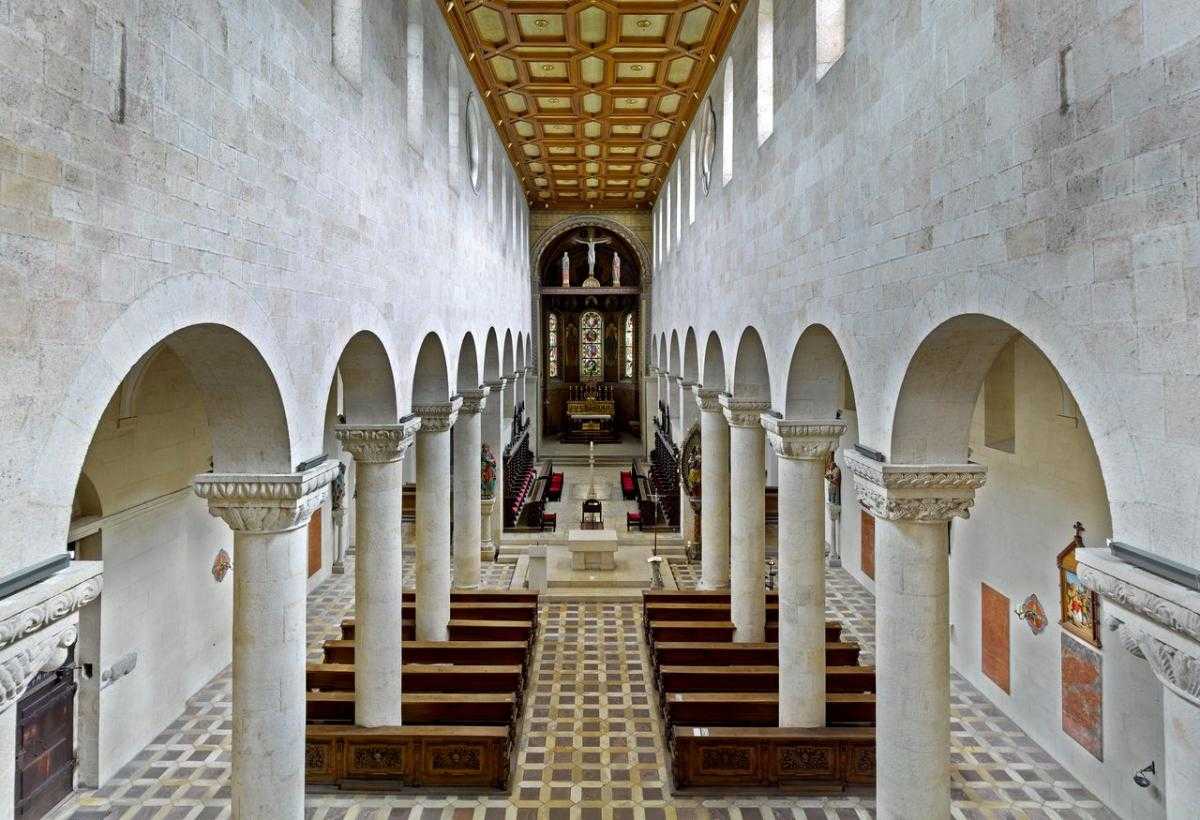 Внутри храм делился обычно на три продольных нефа. Центральный (главный) неф был шире, чем боковые, и переходил в пресвитерий (святилище). Там находился алтарь и во время службы сидел капеллан (пресвитер). Пресвитерий заканчивался полукруглым выступом – апсидой. Под пресвитерием находилась крипта, где хоронили умерших и сохраняли реликвии. Центральный неф пересекался поперечным нефом – так называемым трансептом. Характерной чертой романского стиля были полукруглые арки, применяемые в конструкции сводов, окон и порталов. В XI-XII веках постепенно перестали строить отдельно стоящие колокольни, у новых церквей по сторонам главного входа возводились две башни.
