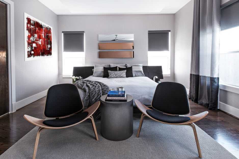 Из классики в серый интерьер прекрасно вписывается черный. Он облагородит комнату и добавит ей выдержанного стиля. Эффектно смотрится вариант сочетания белого, серого и черного, где серый играет главную роль.