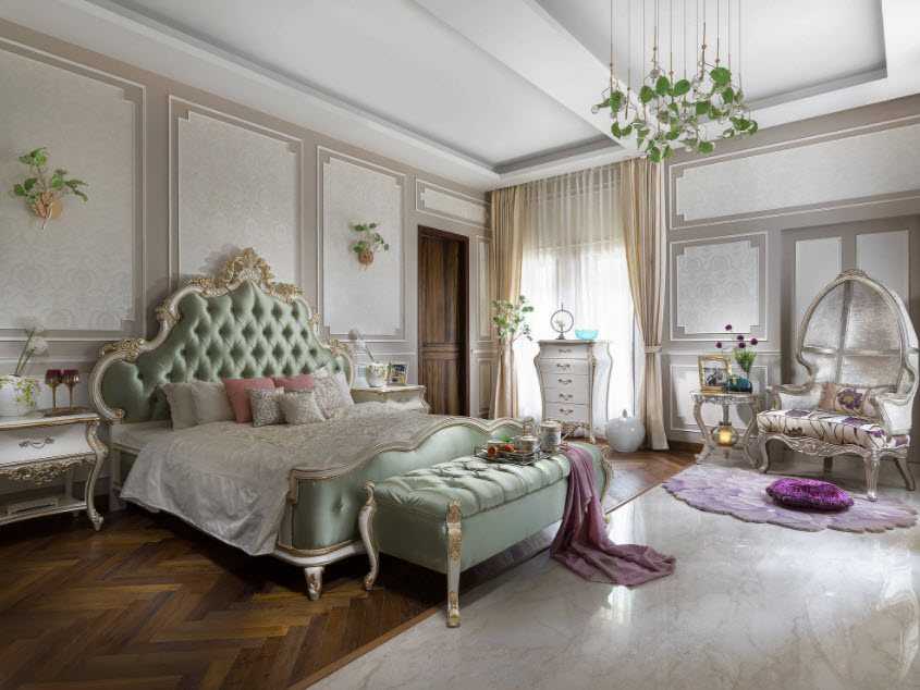 Светлая гамма, характерная для классического стиля, добавит воздуха и пространства в интерьер. На нежном фоне не будут выглядеть громоздкими украшения: лепнина на стенах, колонны, золотые и серебряные узоры, хрустальные люстры. Это сделает декор маленькой комнаты разнообразным. Центральное место в интерьере займет кровать с высоким изголовьем.