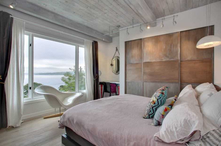 Стиль лофт ассоциируется с просторными открытыми помещениями, напоминающими промышленные здания. В дизайне маленькой спальни получится использовать отдельные элементы индустриального стиля, но они помогут создать яркий дизайн, как на реальных фото спален. Интерьер в стиле лофт отличается грубоватостью, строгостью. Стены без отделки с имитацией кирпичной кладки, деревянные доски на полу, простая мебель станут основой аскетичного мужественного дизайна. Интерьер украсят светильники в индустриальном стиле, несколько черно-белых фотографий, простое зеркало с тонкой рамой. На окнах будут хорошо смотреться лаконичные жалюзи.