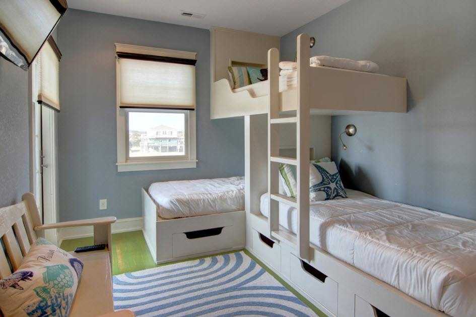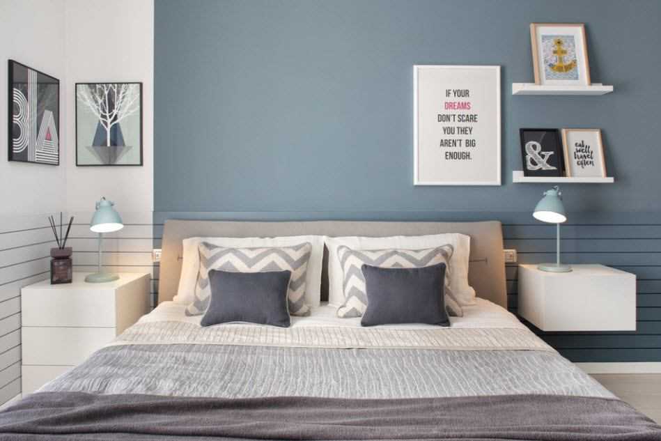 Обстановка в серо-голубых тонах легкая и воздушная при условии выбора нежных и спокойных оттенков. Такое сочетание подарит комнате дополнительный объем