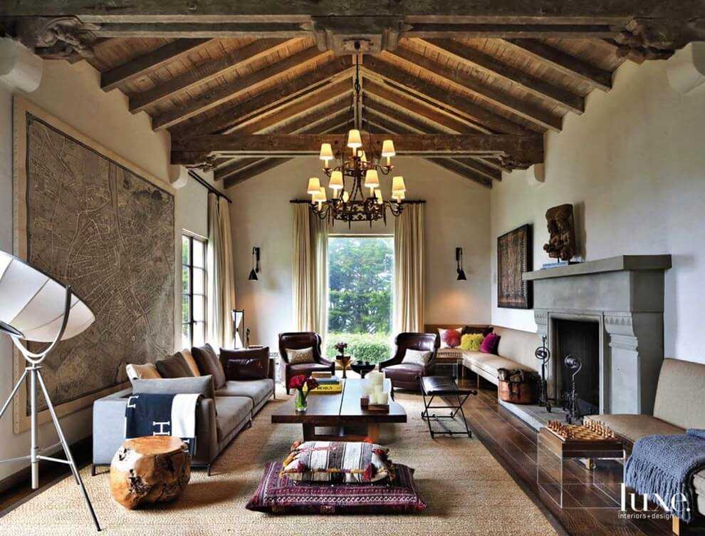 Что касается пола, то напольное покрытие в большинстве случаев делают грубым. Чаще всего можно встретить доски насыщенного шоколадного цвета, но и выбеленный дуб тоже смотрится неплохо. Такие покрытия можно было встретить в домах владельцев ранчо.