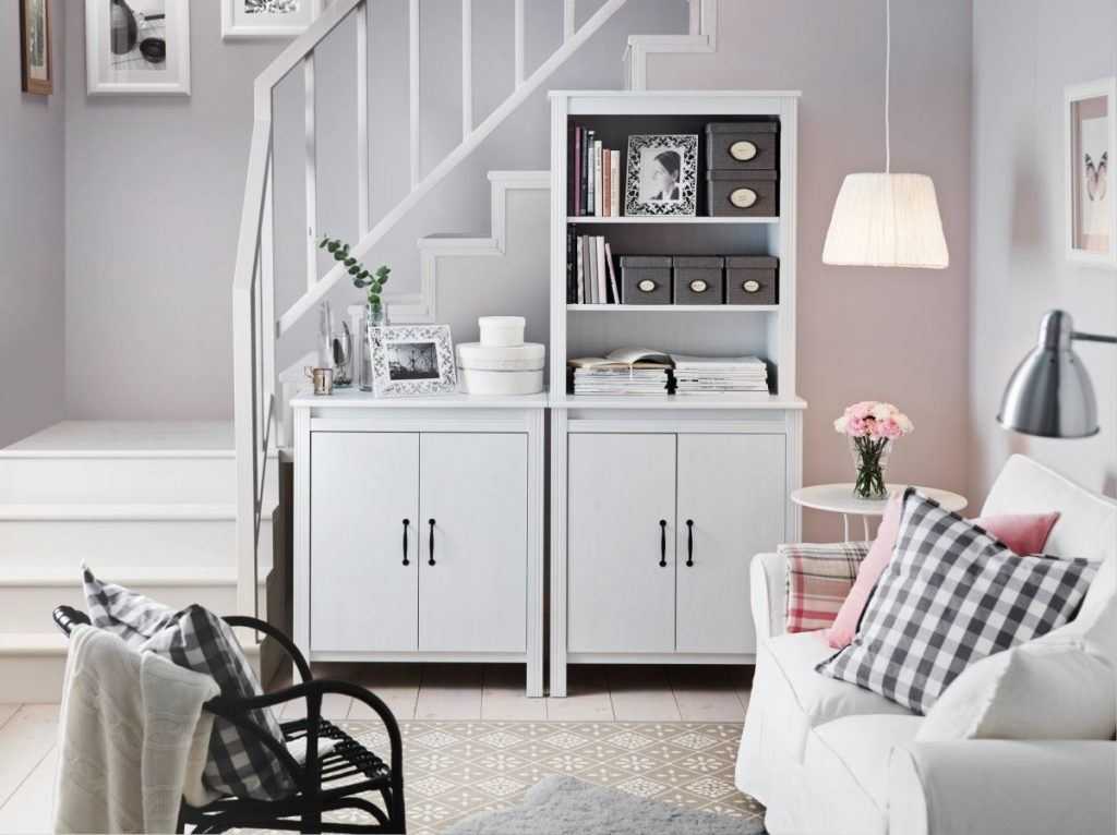 Стеллажи ИКЕА представлены следующими моделями: Хемнэс, Брогульт, Ивар, Билли, Альберт и др. Они незаменимы для гостиных комнат маленькой площади.