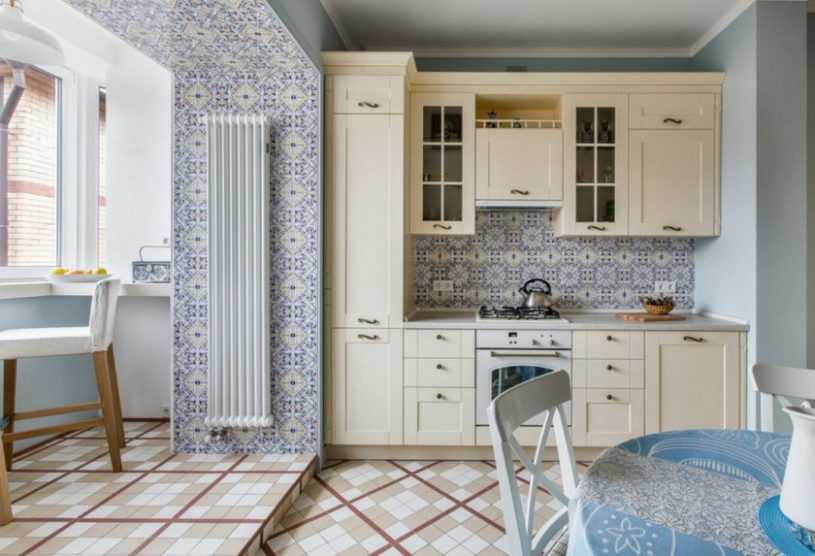 Хорошо смотрится квадратная кухня с балконом, на который вынесена зона для чаепития или чтения. Также за столом, расположенном на перегородке можно обедать или сделать мни-кабинет с ноутбуком и настольной лампой. Этот вариант особенно оценят занятые на фрилансе хозяйки.