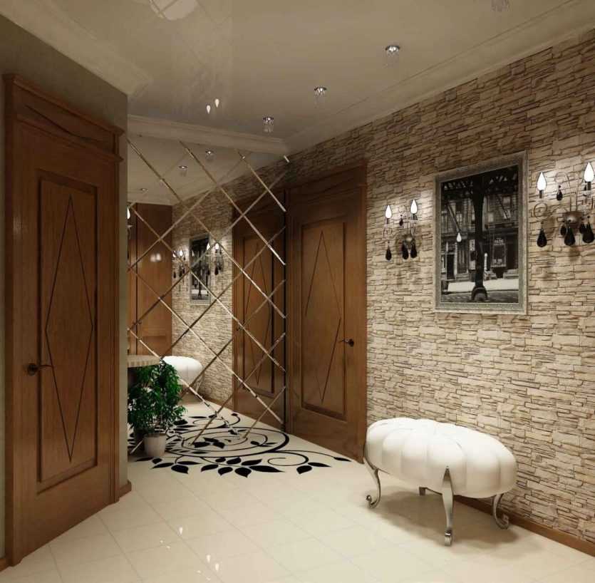 Благодаря светоотражающим поверхностям можно легко скрыть все несовершенства холла или прихожей. Особенно актуально такое решение для небольших узких помещений, имеющих плохое освещение. Для того чтобы расширить пространство, две стены рекомендуется полностью облицевать плиткой. Добиться визуального увеличения площади пространства можно также за счет зеркального потолка.