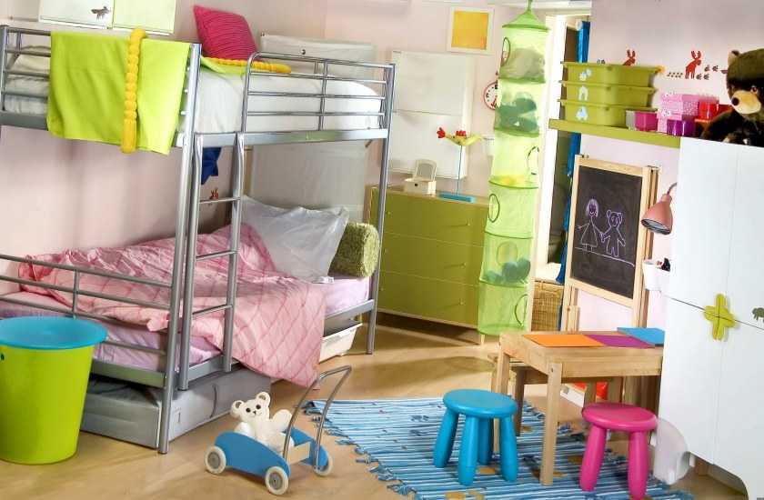 Свободного пространства от пола до матраса нижнего яруса должно быть не менее 40 см. Расстояние между ярусами – 50-70 см. Длина и ширина стандартной детской модели – 180х80 см.