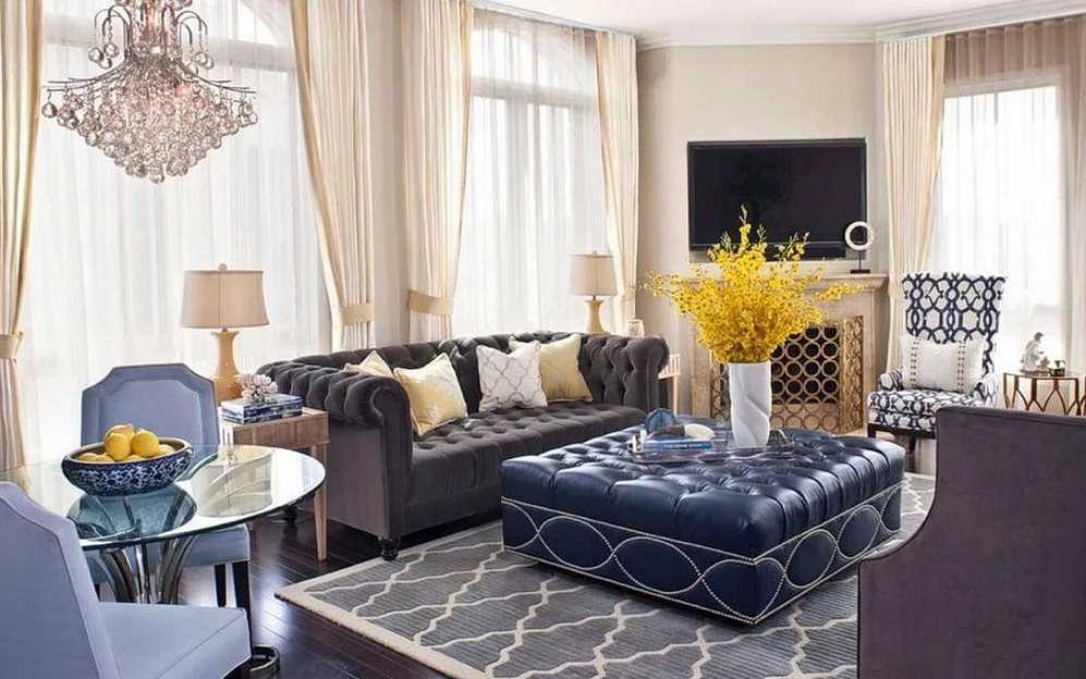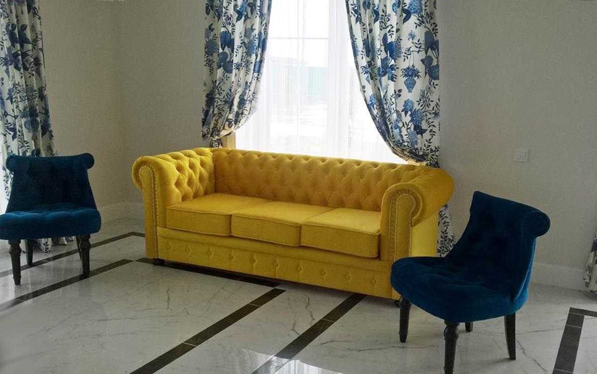Для гостиных чаще отдают предпочтение более светлому или яркому дивану. В общей комнате честерфилд обычно дополняют креслами, но необязательно той же модели.