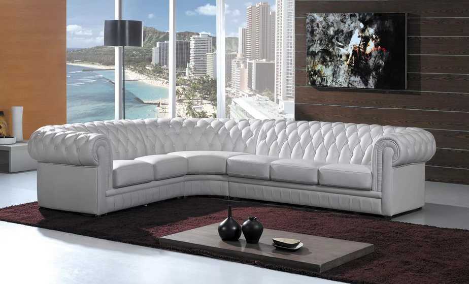 А вот светлая обивка идеально подойдет для современного или гламурного интерьеров. Более того, белый диван честерфилд будет выглядеть изящно и даже немного женственно. Для гостиной можно выбрать более яркие контрастные оттенки. Таким образом, диван станет одним из главных акцентов интерьера.