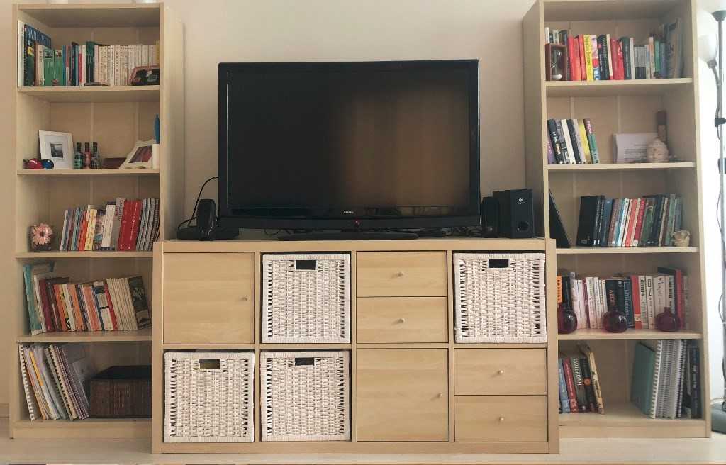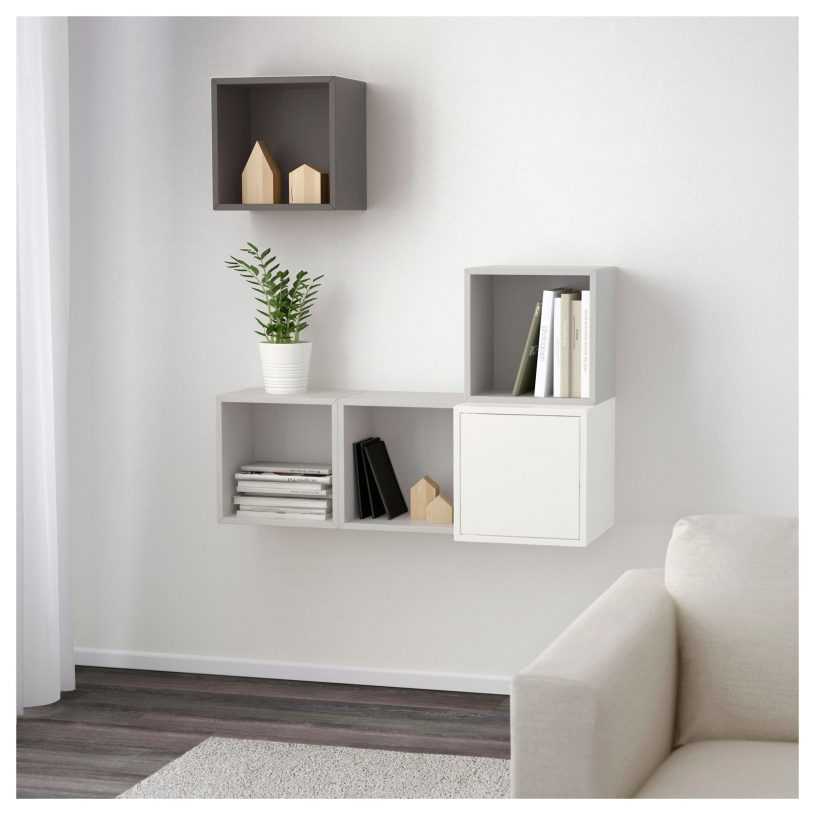 Серо-коричневые стеллажи и шкаф Хэмнес в интерьере гостиной — создаем библиотекуБелая стенка Хэмнес в гостиной: шкафы, тумба под ТВ и подвесной модуль