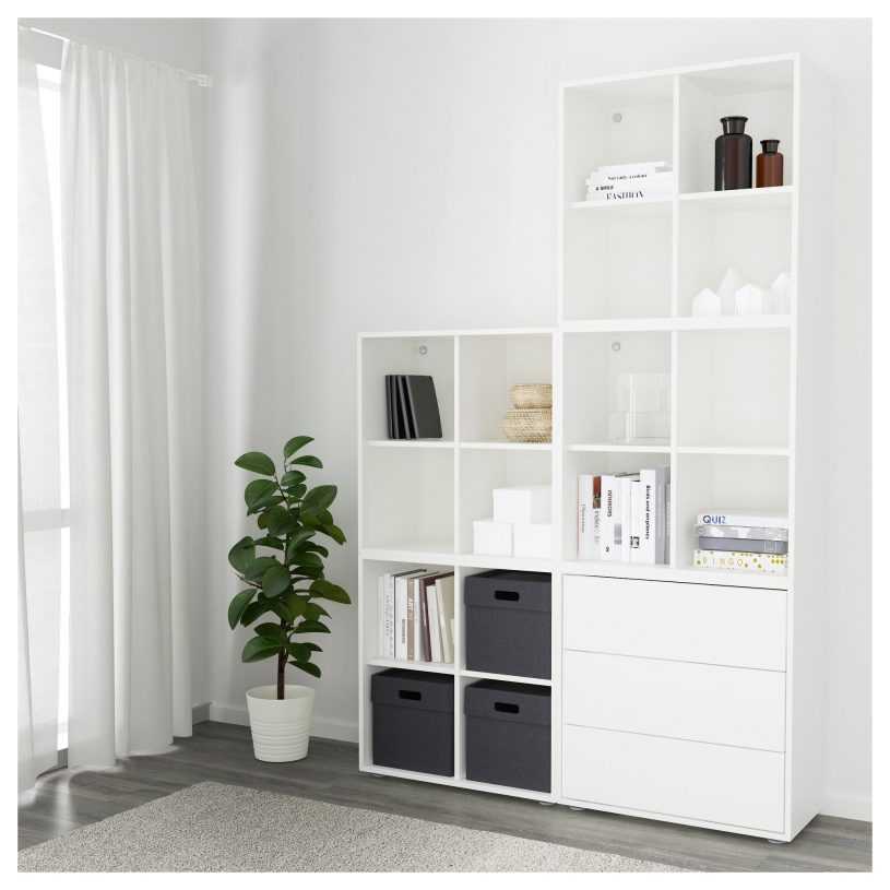 В интерьере светлых комнат гармонично будет смотреться стеллаж от Икеа белого цвета, но иногда применяется контрастное оформление, в этом случае вся мебель белого цвета, а стены и полы темных тонов.