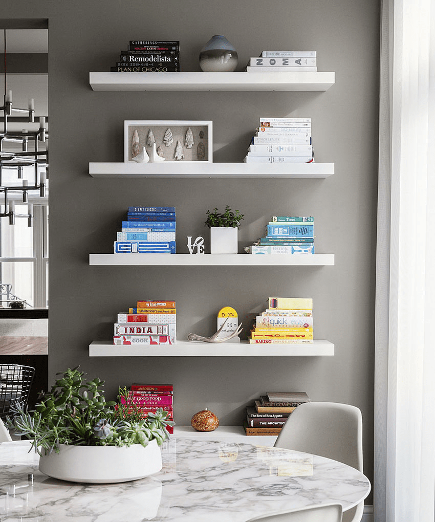 Этажерки подвесного типа идеально впишутся в небольшие дома, в которых дорог каждый сантиметр пространства. Если выбрать несколько моделей и разместить их по разным сторонам стен или по углам, это визуально расширит пространство.