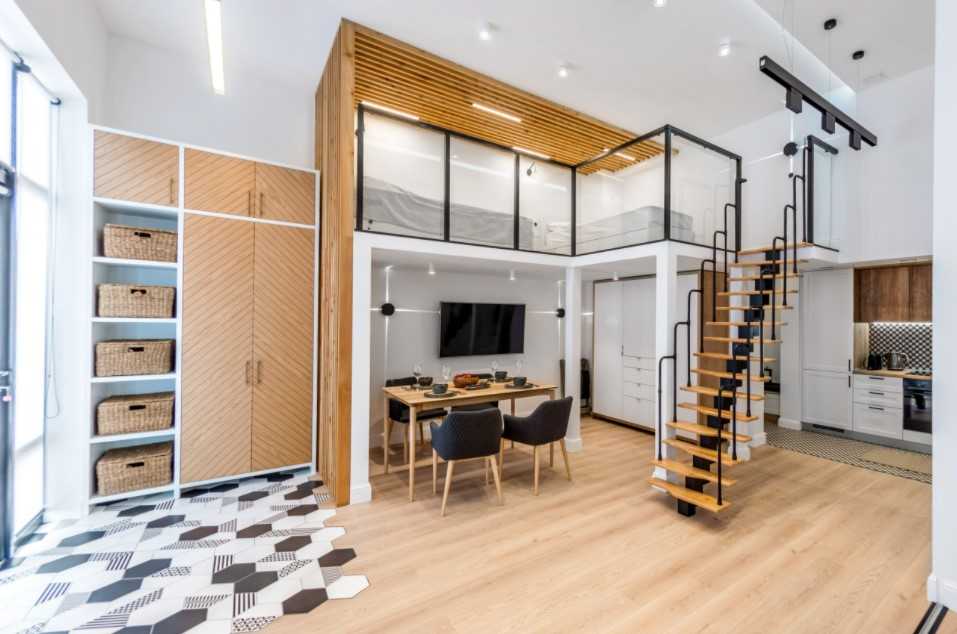 Стеллаж в виде лестницы послужит функциональной перегородкой для объединенной гостиной или маленькой студии. Он занимает меньше пространства, чем прямоугольный шкаф до самого потолка, и не такой громоздкий — так что комната останется визуально просторной.