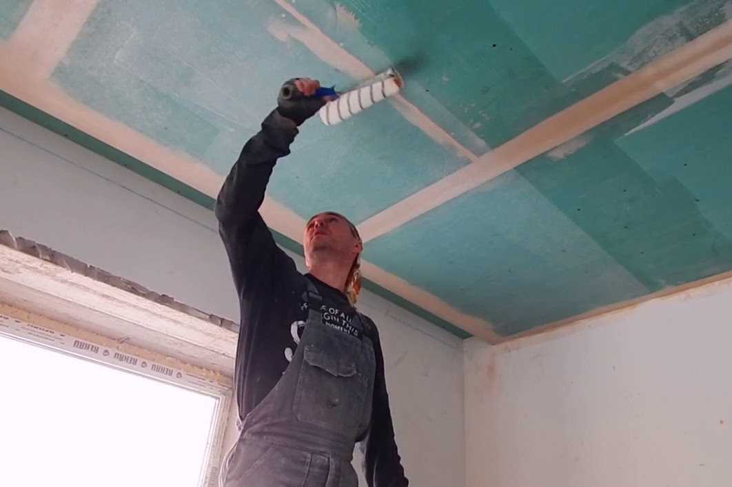 Грунтуют потолок не средствами глубокого проникновения, а клеем.