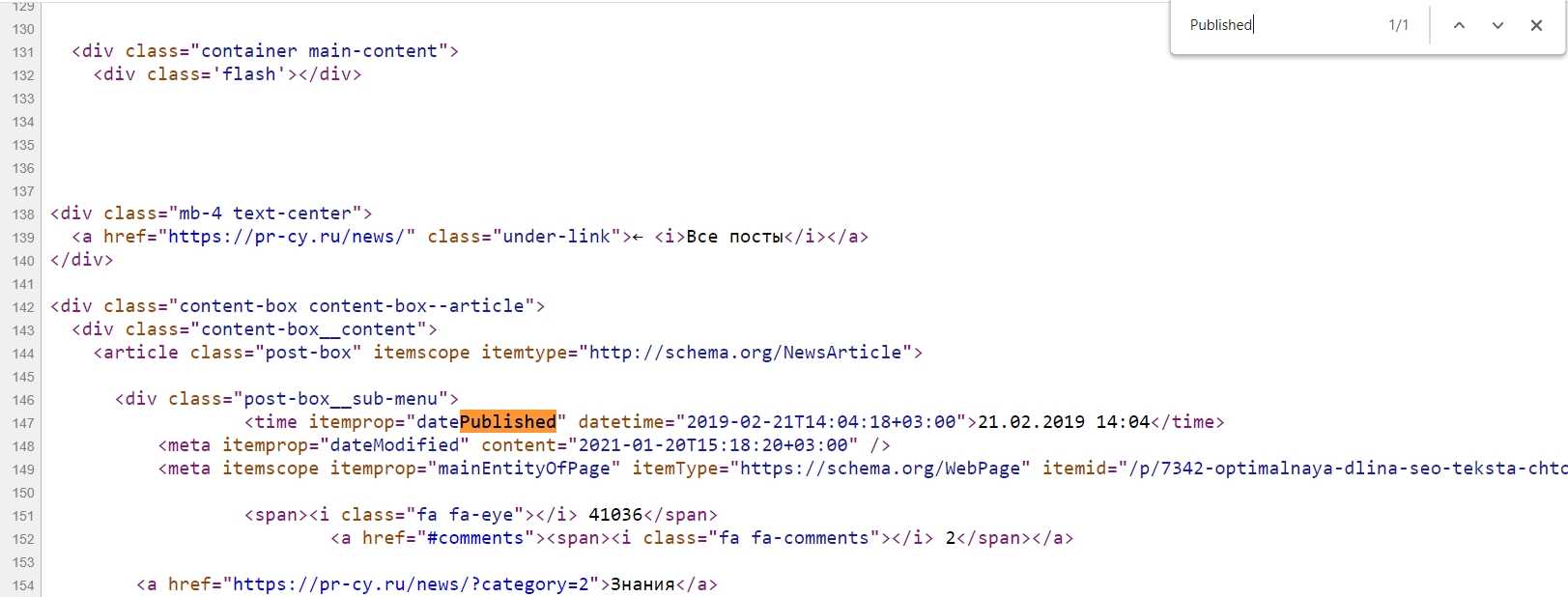 Дата создания и изменения отображается в коде. В Google Chrome нажмите горячие клавиши Ctrl + U, чтобы открыть код страницы, и с помощью поиска Ctrl + F найдите дату публикации по слову Published или дату изменения по Modified.